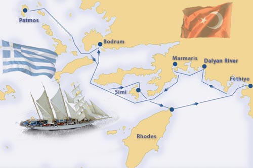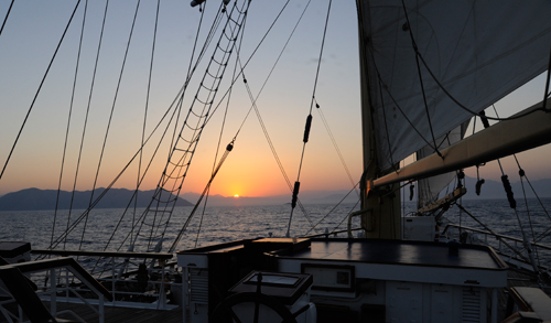 At very short notice Albert and I decided to jump at the opportunity of sailing from Rhodes in the Aegian Sea on the SPV Star Flyer. This sailing ship is the sister ship of the Star Clipper, on which we have already had two wonderful cruises, and is built and decorated exactly the same.